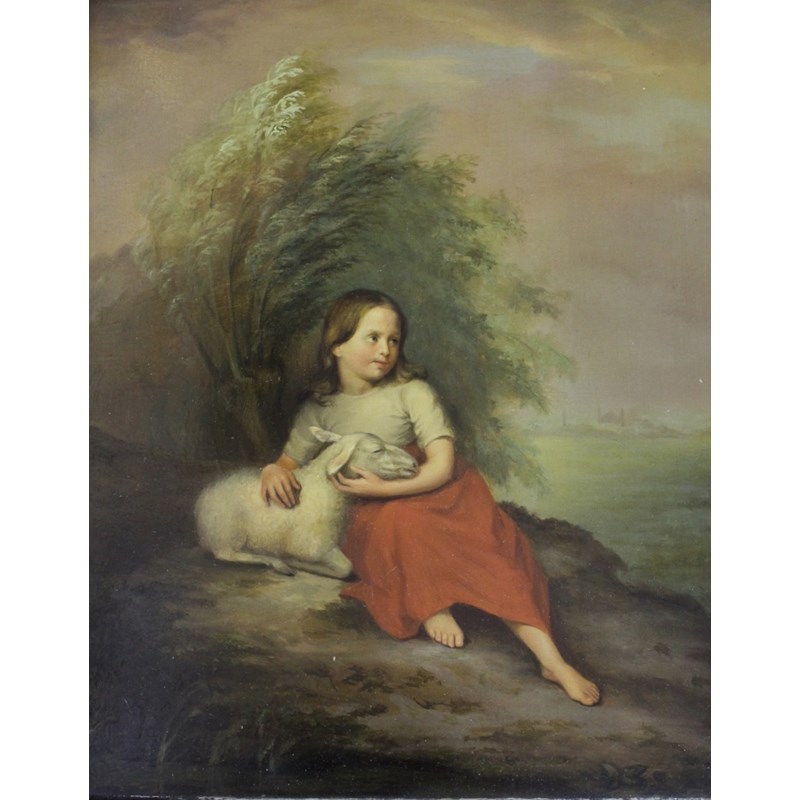 DUTCH SCHOOL, 19th CENTURY CHILD WITH A SHEEP Bears inscription Lux 1869 verso, oil on panel 30 x 24cm.