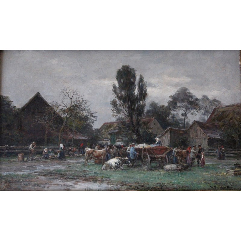 KARL STUHLMULLER (1859-1930) A FARMERS' MARKET Signed and inscribed indistinctly (Munchen ?), oil on panel 33 x 55cm.