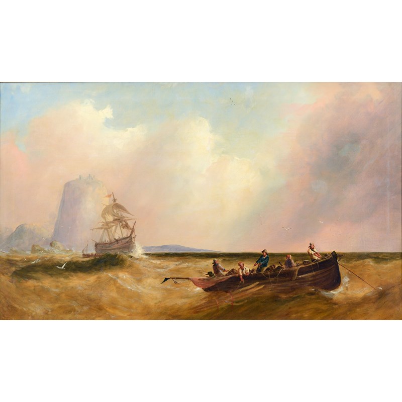 JOHN CALLOW (1822-1878) A FISHING BOAT AND OTHER VESSELS IN COASTAL WATERS Signed, oil on canvas 73.5 x 124.5cm.