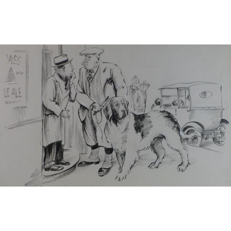 Signed pen and ink drawing of a capped, gaitered and moustachioed rather burly fellow with a St. Bernard dog addressing a bespectacled man as he comes out of a pub. The latter's Austin Seven Chummy stands behind the dog, with two urchins looking on. There is a printed title label in the lower margin of the mount which also states that this was artwork for The Humorist magazine, although not dated. Unframed, but double-mounted. Image size 22.5 x 32.5cm. Good condition except for slight browning along the lower edge, below the artist's signature.