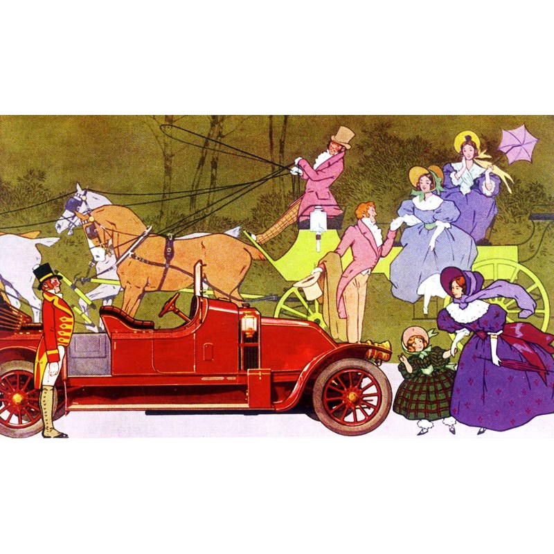 A rare 10-year celebration, brochure, containing a brief outline of the company's history, the construction of their cars, and details of their coachbuilding department and specifications. It also includes a bizarre illustrated story, inspired by H. G. Wells' 1895 novel, 'The Time Machine', by a pseudonymous author named 'Carnovsky, in fact a nom de plume for M. E. Sailland (1872-1956), featuring a tale by 'Tom Charron' and his journey through the ages, and enhanced by five colour pictures depicting scenes from his fantasy tale by Gus Bofa (1883-1969). Square-backed with a faux-leather cover, cotton-tied (now a little frayed), the content in excellent order. French text.