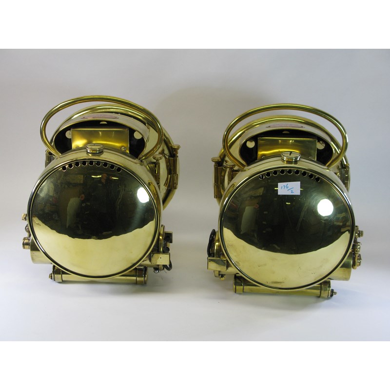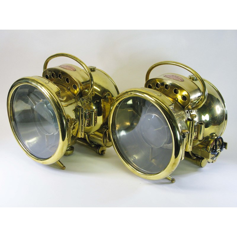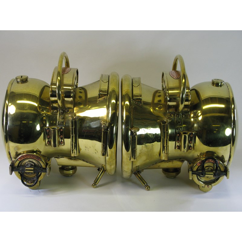 A Pair of B.R.C. 'Alpha' Self-Contained Acetylene Gas Headlamps. Dating between 1903 and 1910, a sided-pair of Boa-Rodrigues & Company factory-made lamps. Manufactured for 'Maison Labourdette', 183 Rue de la Pompe, Paris, (coachbuilders) with engraved insignia fitted to the heat ventilators on each lamp. Other features include parabolic nickel-silver reflectors with mirror lenses, centrally mounted condenser lenses, stout hinges and pull locking bars to each front door, carrying bails, stabilising feet, 7½-inch spaced fork mountings, and both numbered 135. The generators retain their appropriate gas taps, carbide of calcium cylinders and bayonet locking With 11-inch bezels and standing 14-inches high, they are in excellent polished-brass condition. (2)