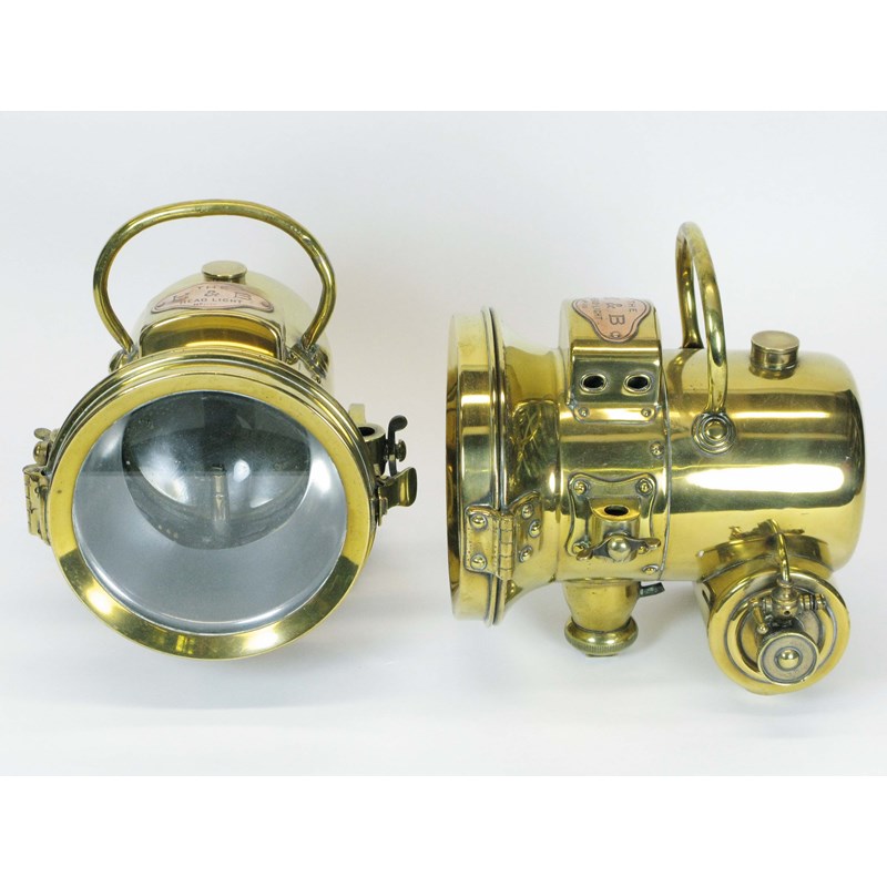 Howes & Burley Lamps. A sided-pair of self-contained acetylene-gas lamps dating just pre-WWI. Finished in polished brass and retaining their condenser covers, carbide of calcium containers, gas taps, water flow adjusters, carrying bails, burners and name plates. They possess stirrup mounts with 6½-inch centres, 5¼-inch front glasses, and Mangin reflectors (one cracked). Towards the end of 1913, these lamps were used on Morris Oxford and other small cars. In fine condition with one gentle (repairable) dent at the rear of the off-side lamp. 9-inches deep, 10-inches high. (2)