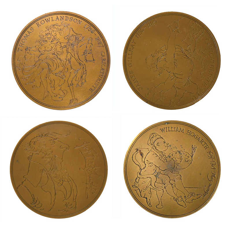 SEARLE, RONALD. Four bronze medals from the series 'Six Fathers of Caricature', representing William Hogarth, James Gillray, Thomas Rowlandson and George Cruikshank, each 85mm diameter, commissioned and struck by the French Mint, 1976-77