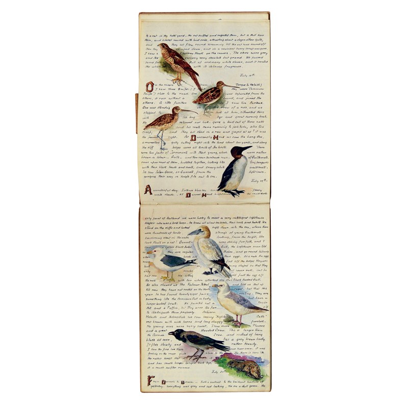 SHAW, M.G. Two manuscript sketchbook diaries by M.G. Shaw, profusely illustrated with drawings of birds, insects and flowers, most entries concerning Fernhurst, Sussex, but also giving account of various journeys to Hereford, Paignton, Honiton, Scotland and overseas to France, etc., watercolour and ink, 120pp. approx., cloth (2)