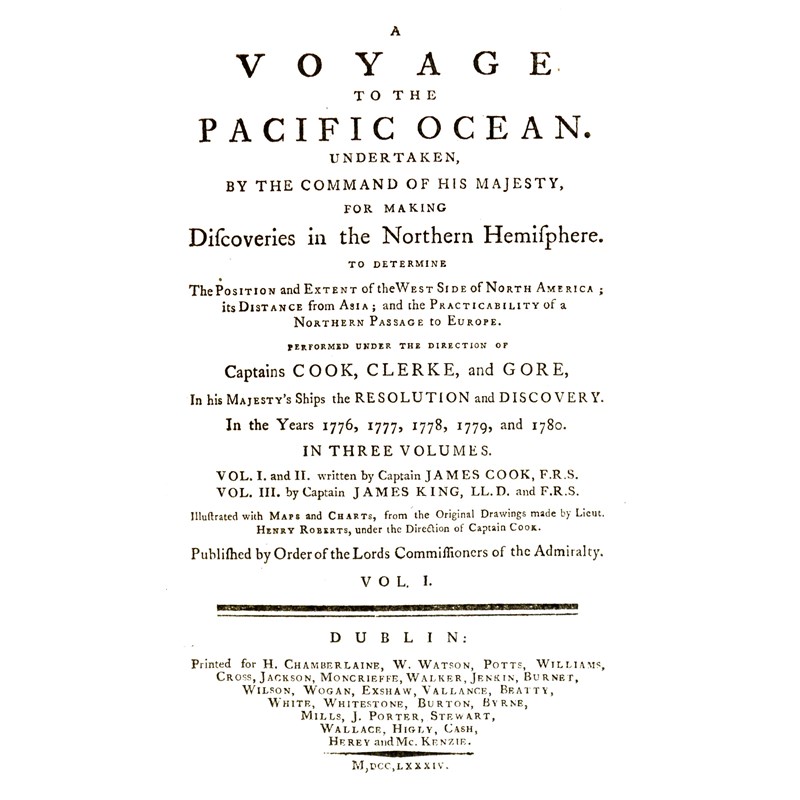 Cook, Captain James. A Voyage to the Pacific Ocean. Undertaken by the Command of His Majesty, for making Discoveries in the Northern Hemisphere... In His Majesty's Ships the Resolution and Discovery. In the Years 1776, 1778, 1779, and 1780, 3 volumes, engraved portrait frontispiece, 28 folding engraved plates and charts, one slightly torn, folding table, some browning, contemporary mottled calf, rubbed, bookplate of John Walker Heneage, 8vo, Dublin: H. Chamberlaine, et al., 1784