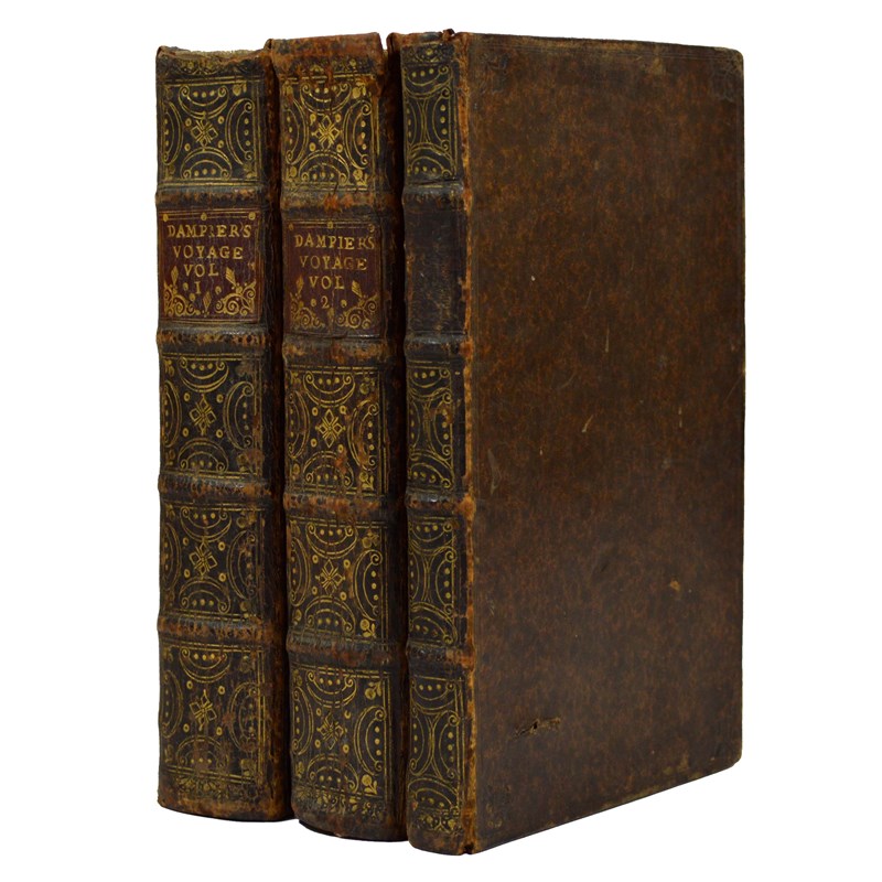 Dampier, William. A New Voyage Round the World, 3 volumes, mixed edition, 9 folding engraved maps and one single page, 14 engraved plates, including 4 of island profiles, ?pp.88-89 in volume 3 supplied as cancel, loose, 4pp. of advertisements at the end of volume 1, somewhat browned, volume 2 with some leaves waterstained, contemporary mottled calf, spines tooled gilt in compartments, rubbed, hinges a little cracked, 8vo, London: James Knapton, 1703-1705