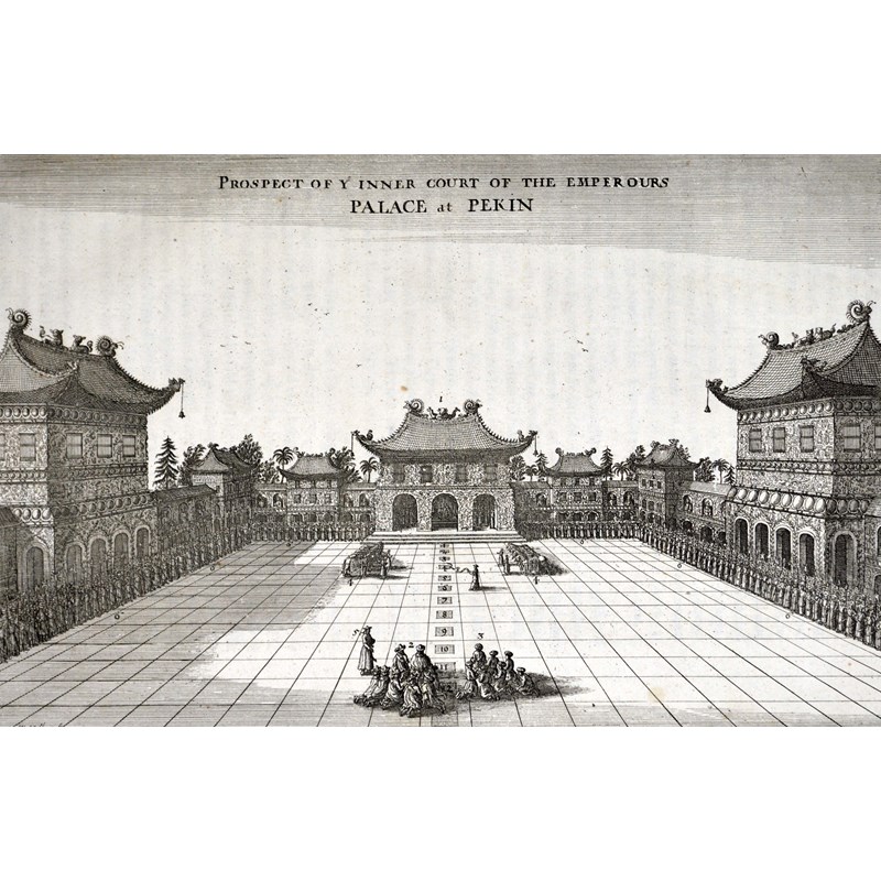 Nieuhoff, Jan. An Embassy from the East India Company of the United Provinces to the Grand Tartar Cham, or Emperor of China, second edition, engraved additional title, double-page engraved map, 18 engraved plates, one double-page, 93 engraved vignettes, Fff2 and Iiiii torn and crudely repaired, folio, London: Printed by the Author, 1673; bound with, Montanus, Arnoldus. Atlas Chinensis: Being a Second Part of a Relation of Remarkable Passages in two Embassies from the East-India Company of the United Provinces, to the... Emperor of China and East-Tartary, translated by John Ogilby, first edition in English, 38 engraved plates, including 28 double-page and 4 folding, 57 engraved vignettes, the maps lacking, rust hole in O4, slightly affecting text, folio, London: Tho. Johnson, 1671, [Wing M2484], contemporary calf, worn, boards detached, bookplate of Bath Public Reference Library, occasional blindstamps throughout