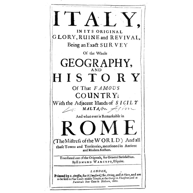 Schottus, Franciscus. Italy, in Its Original Glory, Ruine and Revival, Being an Exact Survey of the Whole Geography, and History of that Famous Country; With the Adjacent Islands of Sicily Malta, &c.... translated out of the Originals, for General Satisfaction by Edmund Warcupp, first edition in English, 2 double-page plates, lacks engraved additional title, rust-mark on Pp, final leaves affected by damp, contemporary calf, spine chipped, joints cracked, bookplate of Bath Public Reference Library, folio, London: S. Griffin, 1660 [Wing S891]