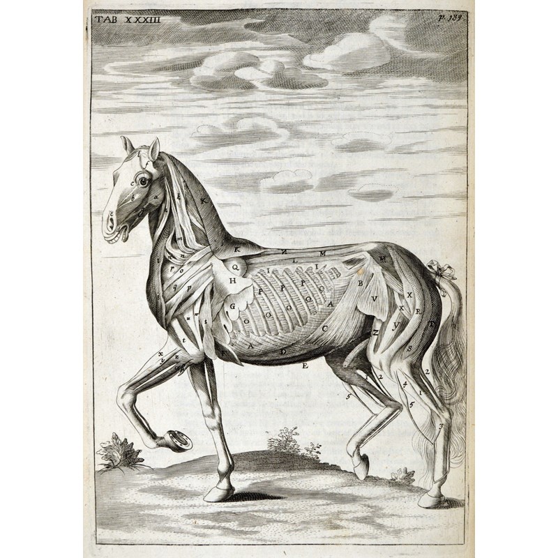 Snape, Andrew. The Anatomy of an Horse. Containing An Exact and full Description of the Frame, Situation and Connexion of all his Parts (with their Actions and uses) exprest in Forty nine Copper-plates, 2 parts in one volume, engraved portrait frontispiece, 49 engraved plates, some spotting and light browning, a few leaves with minor staining in gutter, contemporary panelled calf, boards loose, folio, London: M. Flesher, 1687