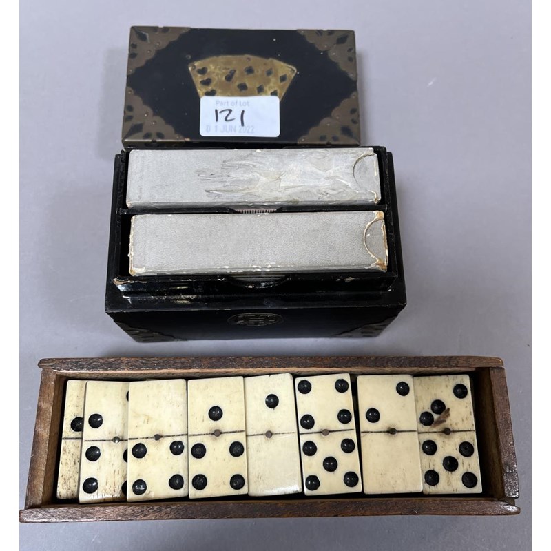 Japanese Lacquered Playing Card Box and Set of Bone Dominos
