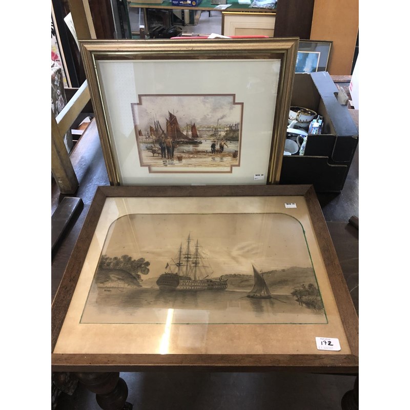 Pencil Drawing of Men of War in an Estuary, 19th Century; and a Print