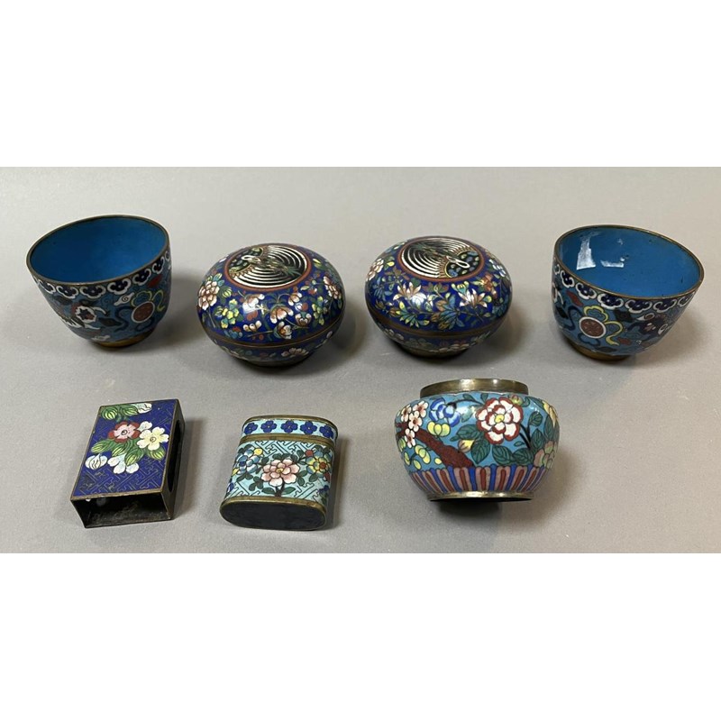 Two Cloisonne Enamel Boxes, Three Cups, Three Assorted Boxes, Jar and Matchbox Cover (10)