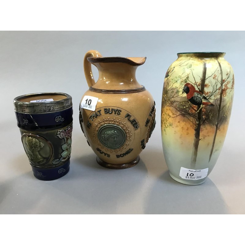 a narrow vase painted with a variety of birds amongst branches, signed J Price (19cms high, dated 3.10.28). Also with a Doulton stoneware jug with various figures in medallions with phrases around (restoration to base), and a Edward VII Coronation beaker (broken and repaired). (3)