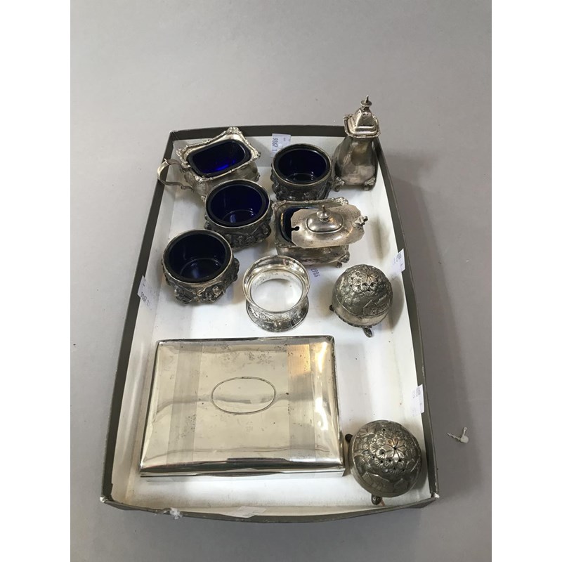 Silver Cigarette Box, Condiments, Napkin Ring (lot)