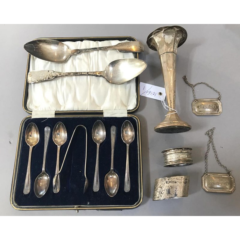 Cased Set of Six Silver Coffee Spoons, Two Spirit Labels, Two Napkin Rings, Silver Vase (Filled) etc, Total 12.5 Ozt