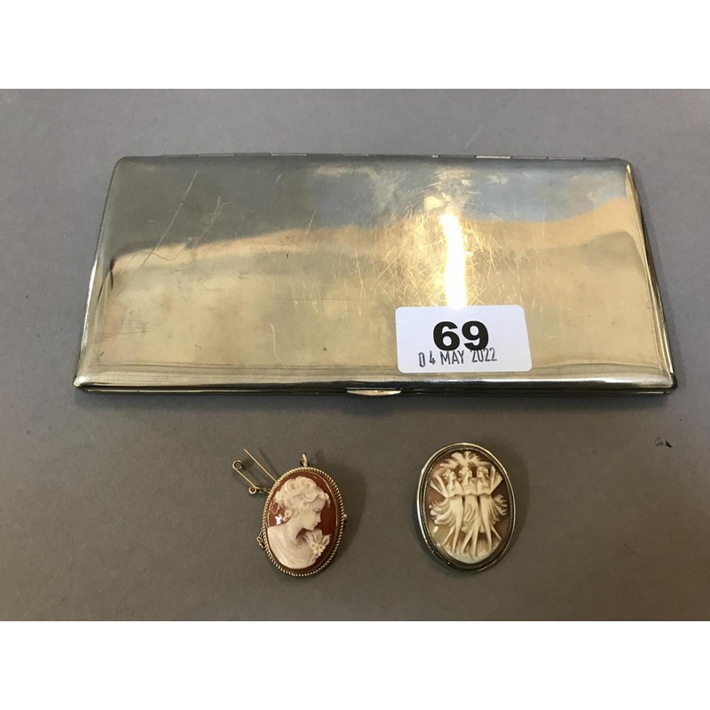 9ct Gold Cameo Brooch and Another and a Plated Cheque Book Case