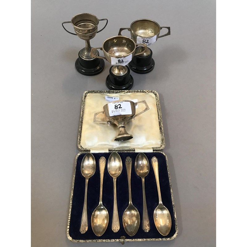 Four Miniature Silver Trophies and Cased Silver Spoon Set (Golfing Interest), Total 6.7 Ozt
