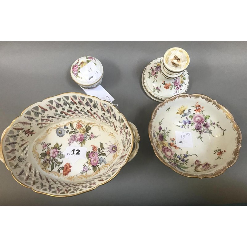 Meissen Bowl on Stand, Porcelain Basket and Jar and Cover (A/F)