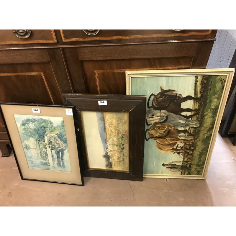Three Pictures, inc. Watercolour by Evelyn Howard, Oil on Board by Fritsch, 'Horses Ploughing'