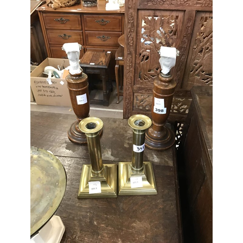 Pair of Brass Candlesticks and a Pair of Wooden Candlesticks