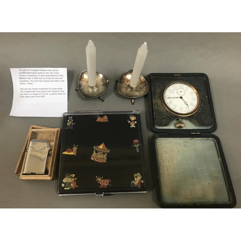 Danish Silver Plated Candle Holders, Boxed Lighter, Desk Clock and Magic Roundabout Pins