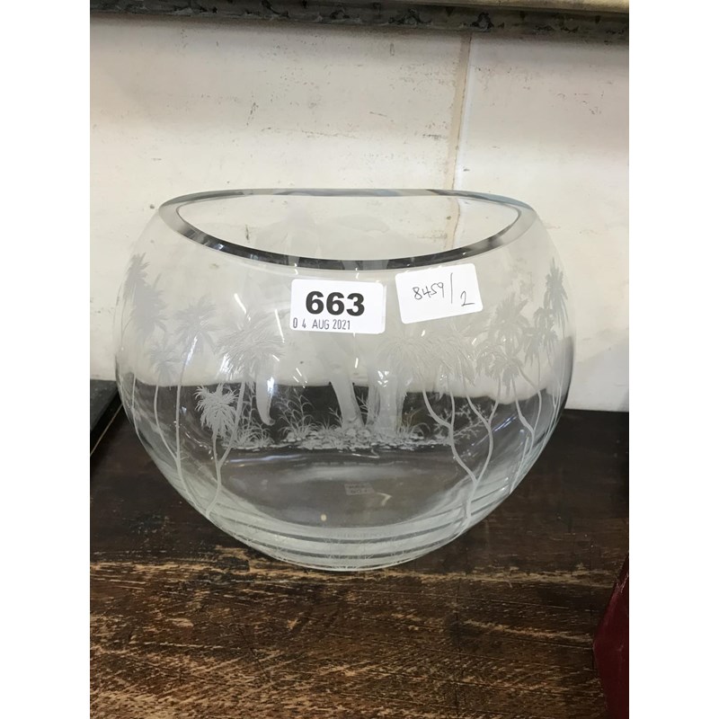 an etched glass vase with a depiction of an Elephant on one side and foliage in the manner of David Shepherd, the front with various trees and inscribed Kenya 2000, A Memento. Etched marks to base, The Glass Gallery, Nairobi Kenya, 1999, Ivambui Nellie. 21cms high