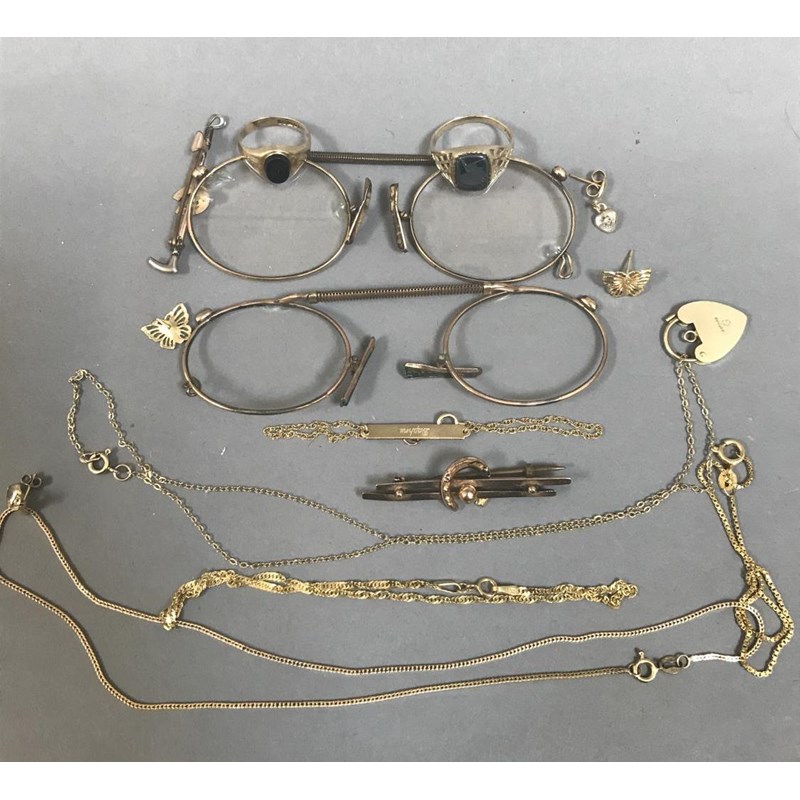 Qty of Gold Items to include 9ct Rings, Chains, Gilt Rimmed Glasses etc