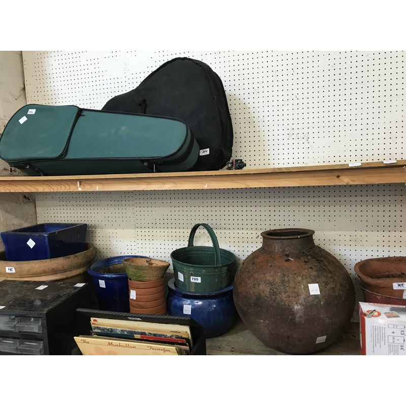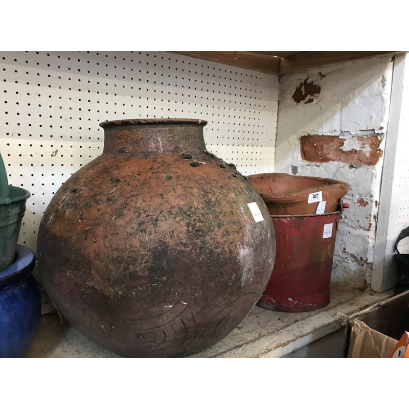 Two Glazed Pots, Two Terracotta Pots and a Galvanised Painted Bucket, etc