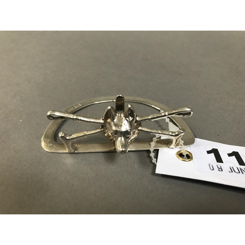 AN EDWARDIAN MENU CARD HOLDER on a fox-hunting theme, by William Hutton & Sons, London 1904; 2.65" (6.7 cms) long; 0.45 oz