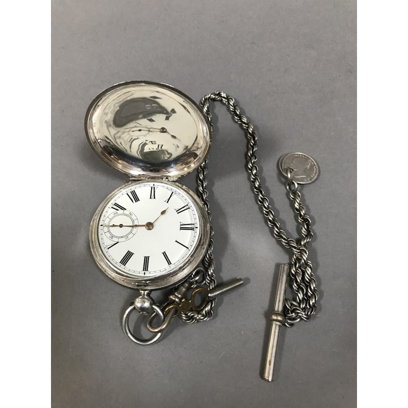 Silver Hunter Fob Watch with Albert Chain, Key and 2 Silver Coins - Working Order Not Tested