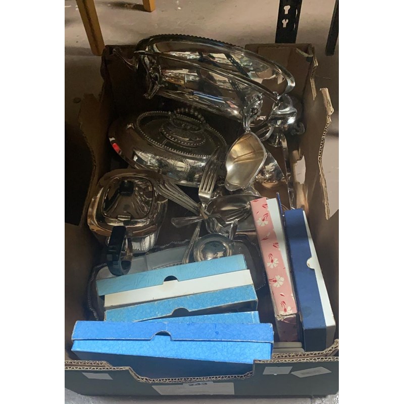 Box of Assorted Silver Plate to include Teapot, Cutlery etc