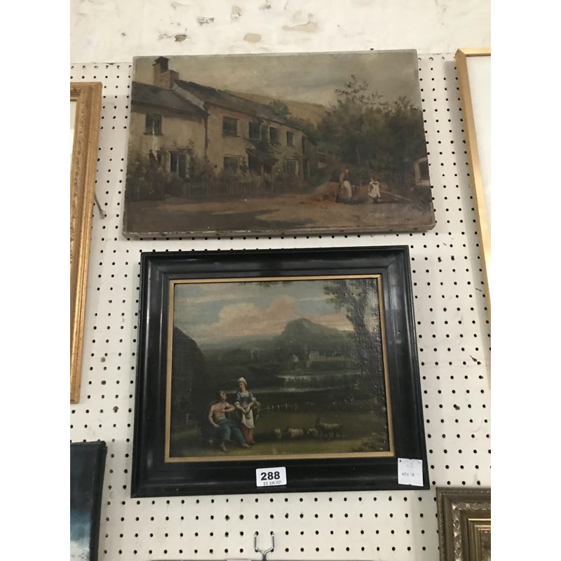 Oil on Board, Figures in a Landscape, c. 1800 23cm x 29cm and an Oil on Canvas of a Cottage Scene, 30cm x 46cm