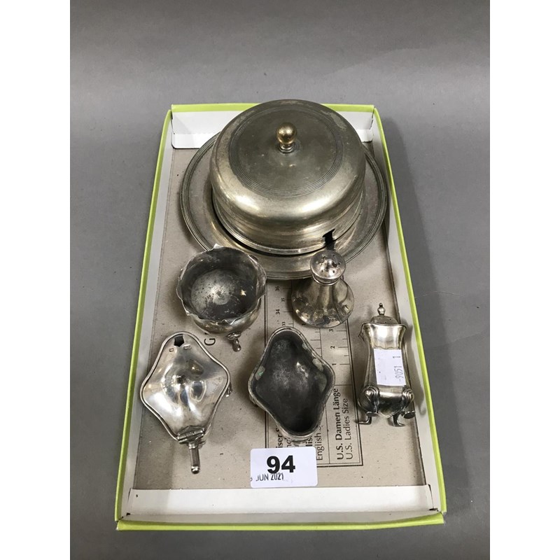 Silver Three Piece Condiment Set and Silver Salt and Plated Dish and Cover and a Plated Pepper