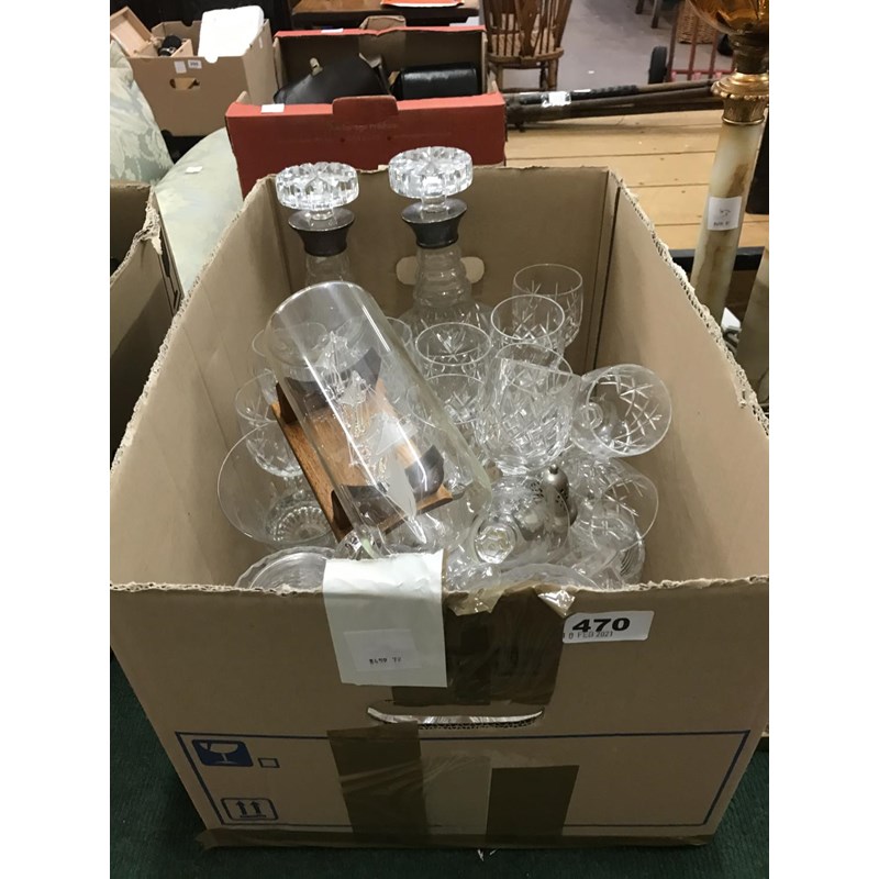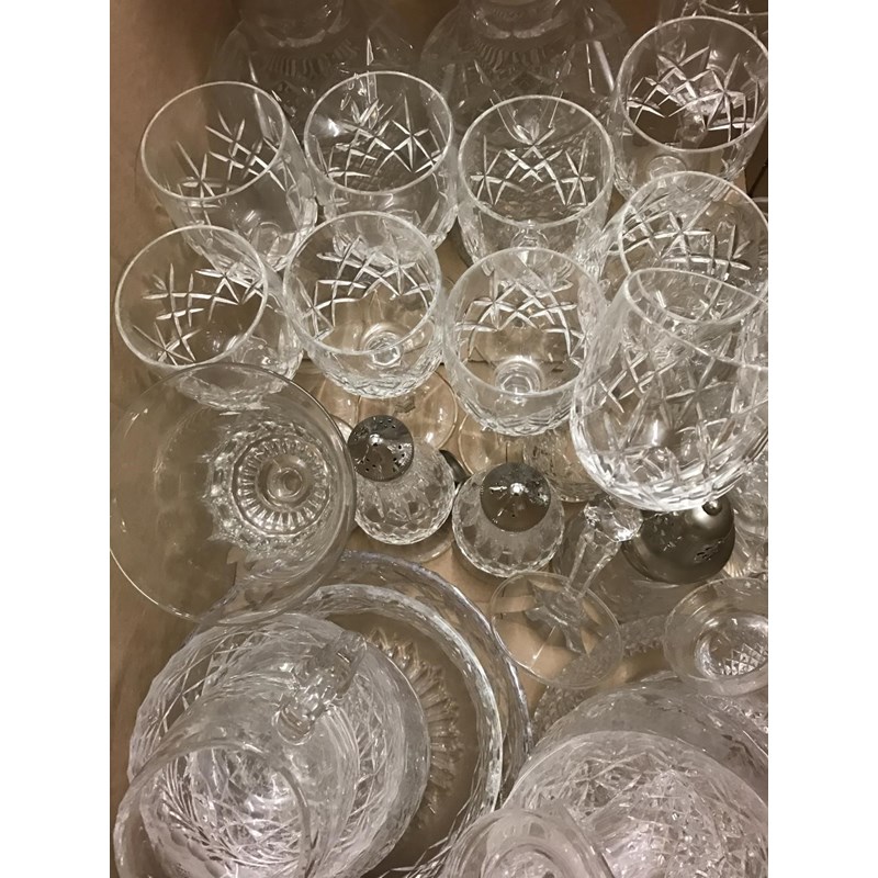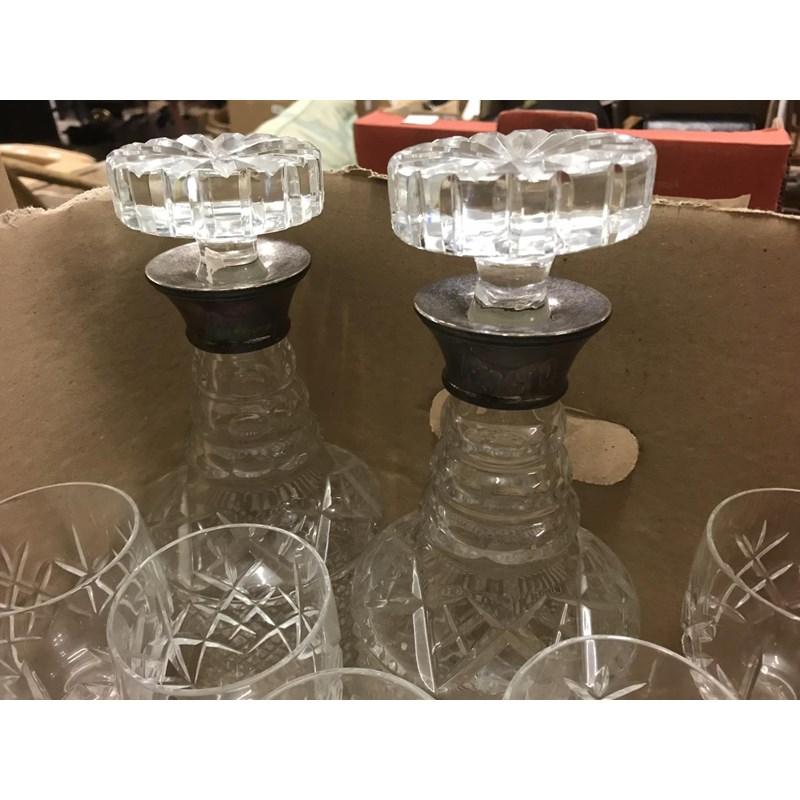 Box of Cut Glass including Two Silver Topped Decanters and a Ship in a Bottle