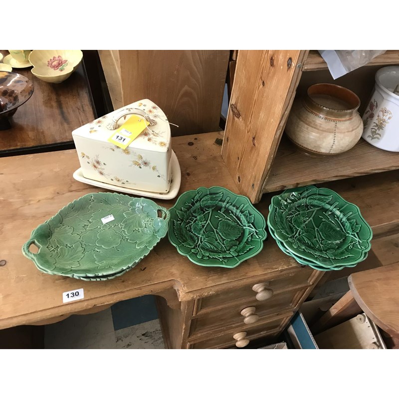 Victorian Pottery Triangular Cheese Dish and Cover and Six Leaf Patterned Green Plates