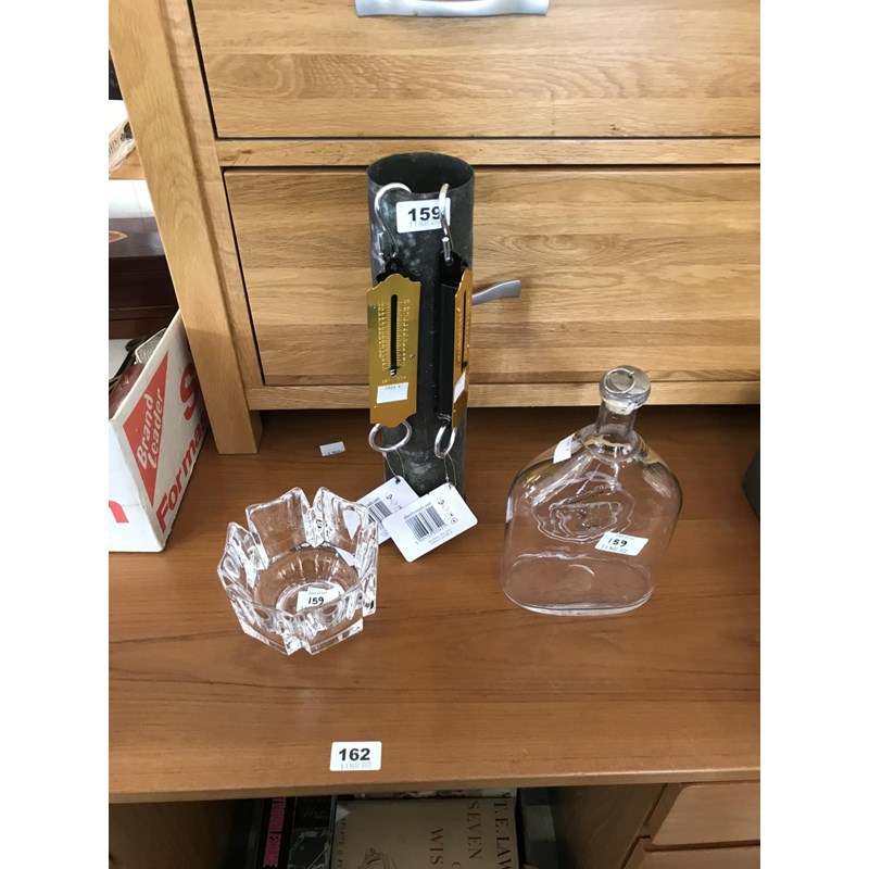 WWI Artillery Shell, Brass Hanging Scales, signed Glass Bowl and a Bottle
