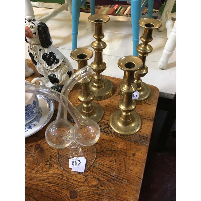 Four Brass Candlesticks and Glass Vase