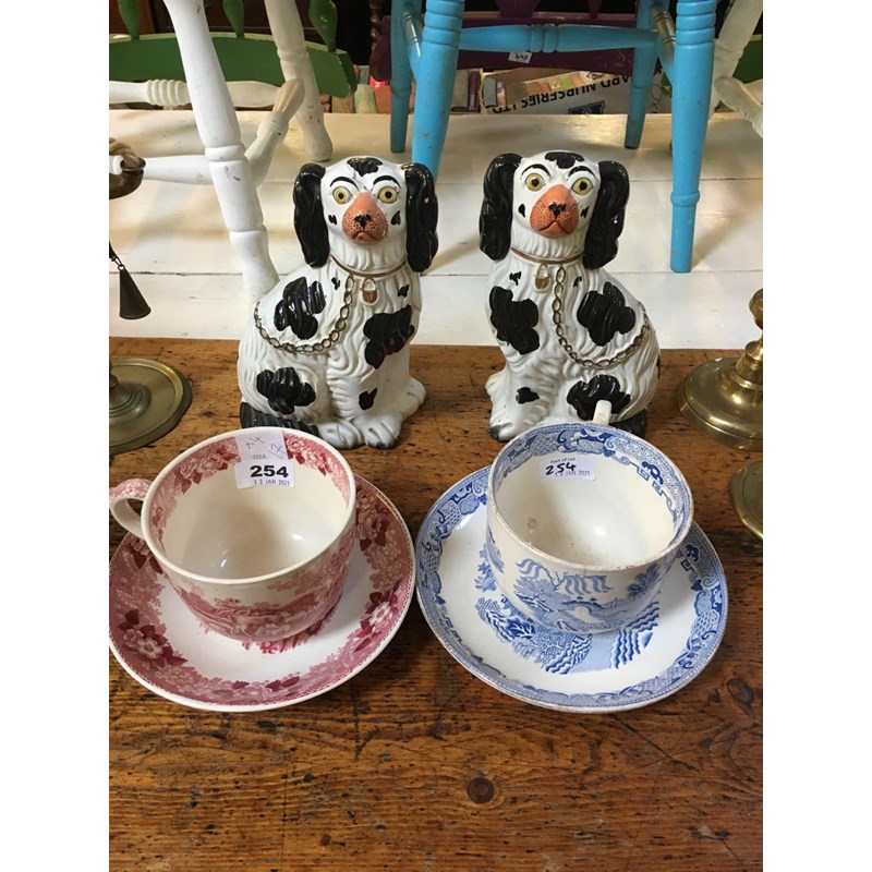 Pair of Staffordshire Dogs and Two Breakfast Cups and Saucers