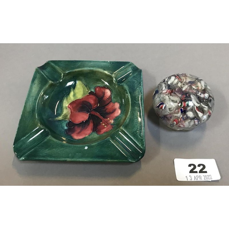 Moorcroft Ashtray and Coloured Glass Paperweight (2)