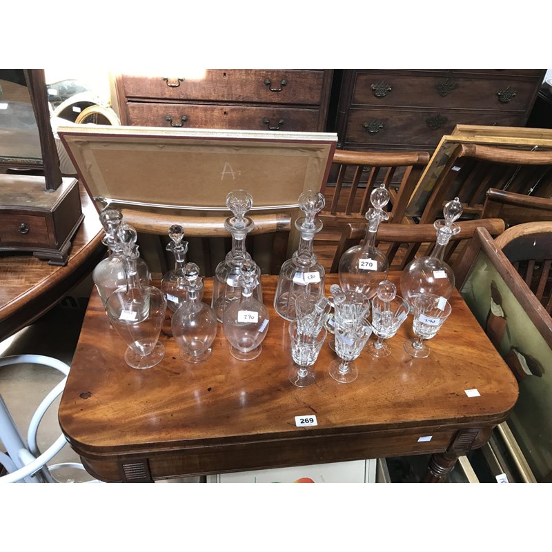 Nine Various Glass Decanters and Set of Six Wine Glasses