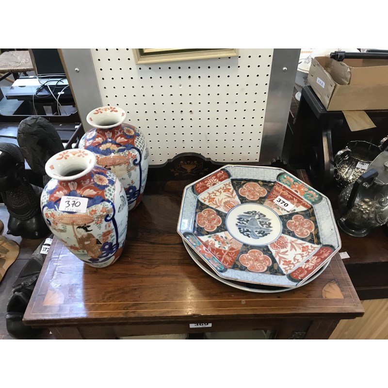 Japanese Octagonal Imari Dish, Another Plate and Two Imari Vases