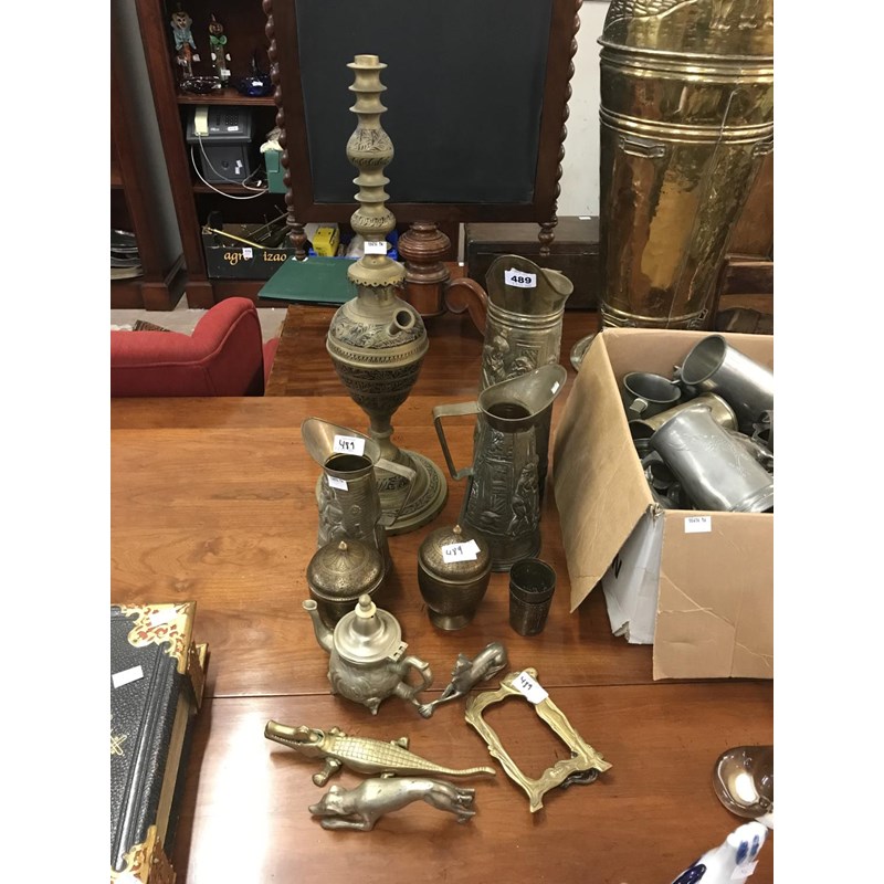 Three Brass Graduated Jugs, Miniature Frame etc