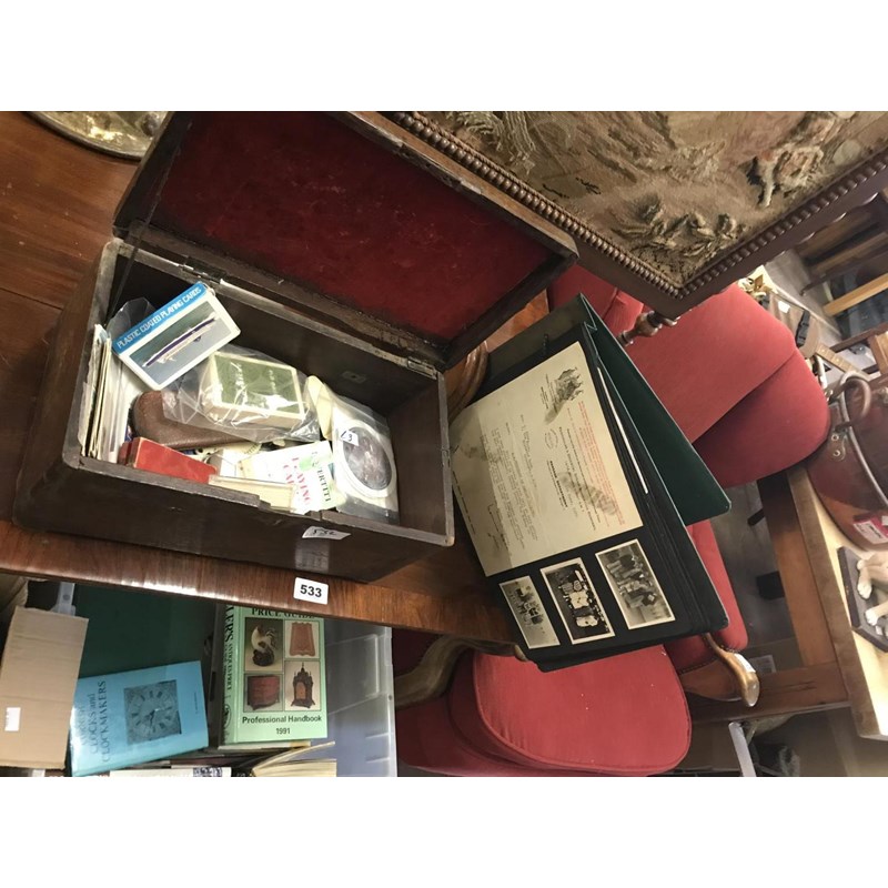 Wooden Box containing Postcards, Photo Album etc and Other Collectables