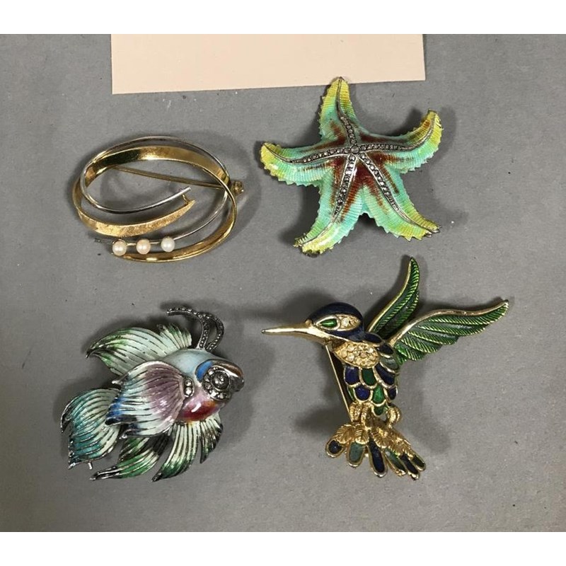 Silver and Enamel Fish and Starfish Brooches, Another Kingfisher Brooch and a 14ct Brooch (4)