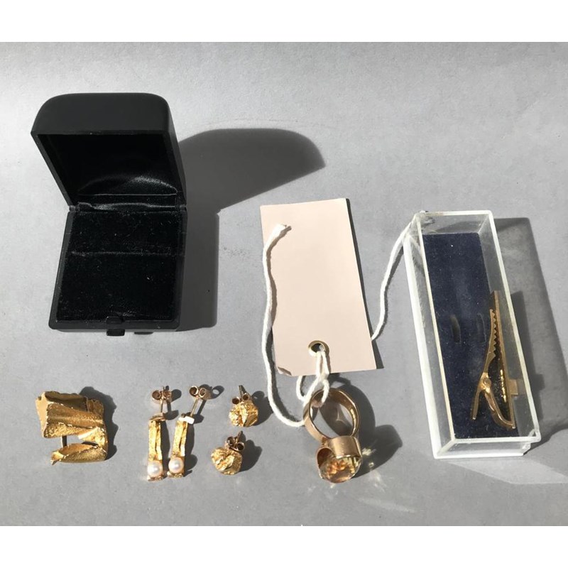 14ct Ring, Brooch, Tie Clip and Two Pairs of Earrings