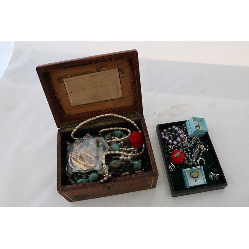 Wooden Box of Costume Jewellery including Sterling Silver Ring