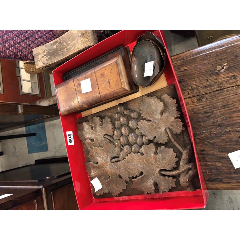 Wooden Inkwell, Carved Plaque, and Three Copper Discs