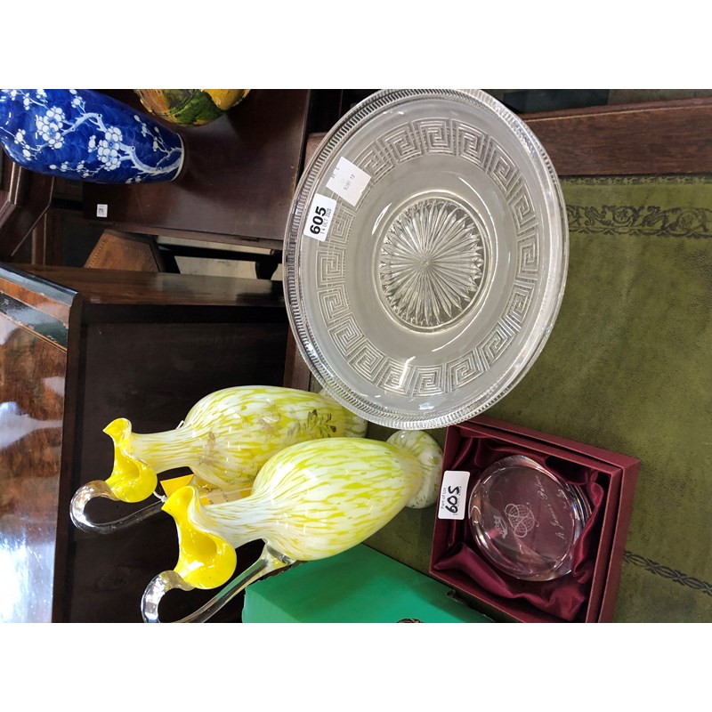 Pair of Yellow Flashed Glass Ewers, Pair of Plates and Paperweights