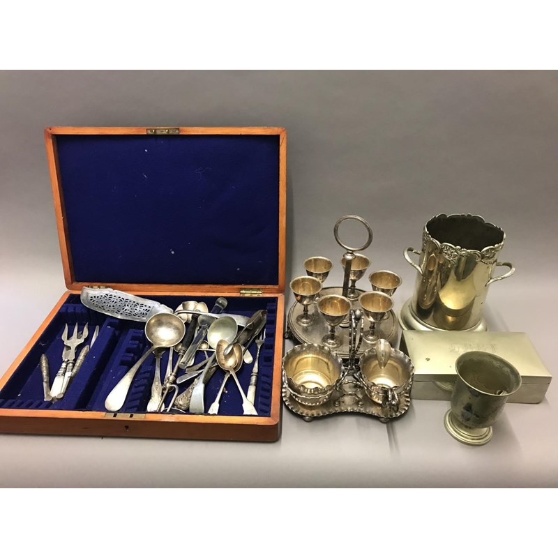 Box of Platedware to include Cruet Frame, Canteen of Mixed Flatware and Other Plated Items